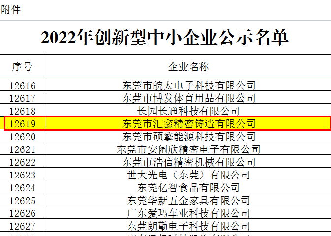 喜報(bào)|東莞市匯鑫精密鑄造有限公司榮獲廣東省“2022年創(chuàng)新型中小企業(yè)”認(rèn)定!